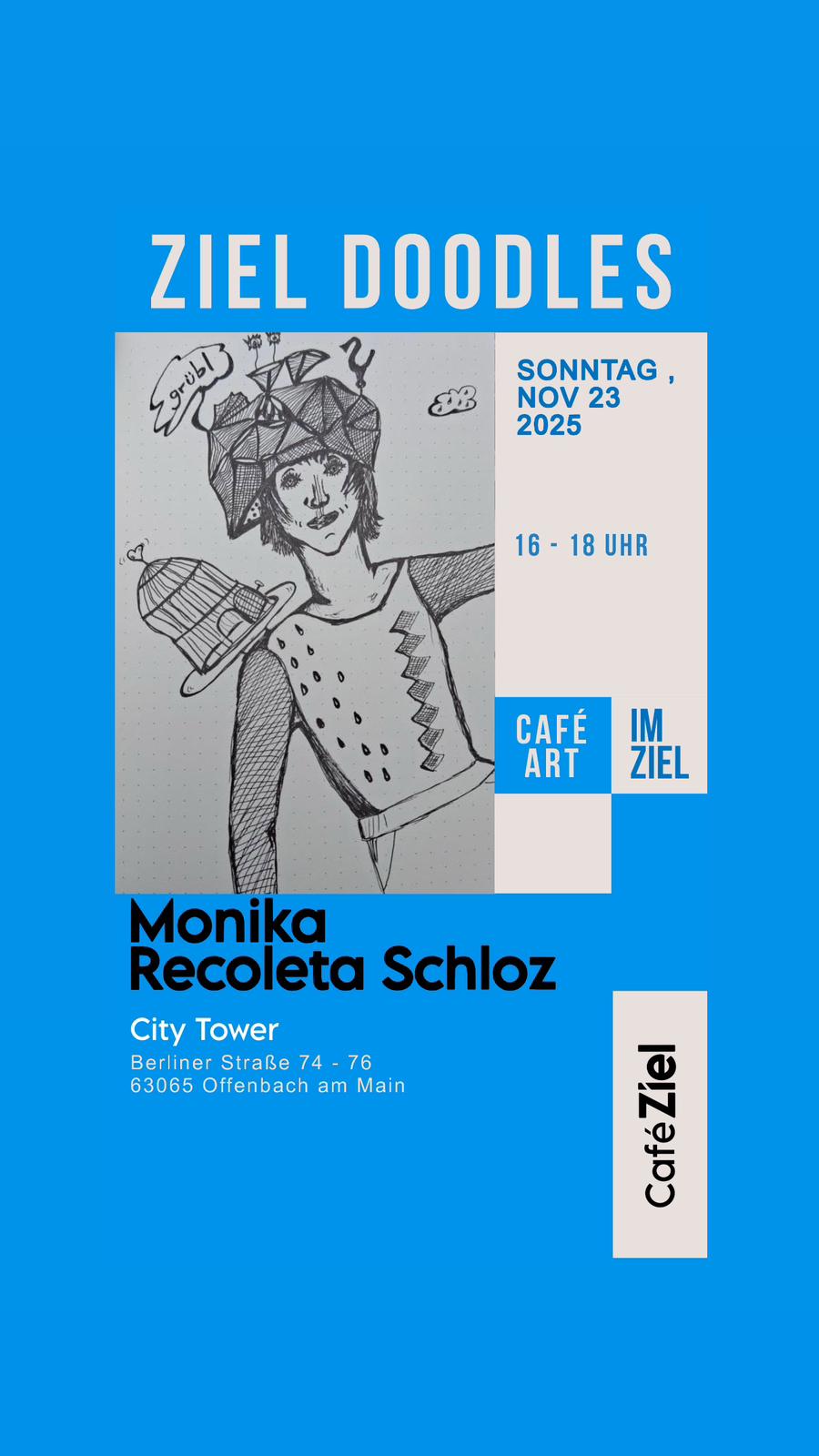 Vernissage der „Ziel Doodles“, also von Zeichnungen, die im Café Ziel entstanden sind, am 23.11.25 um 16.00 in Offenbach.